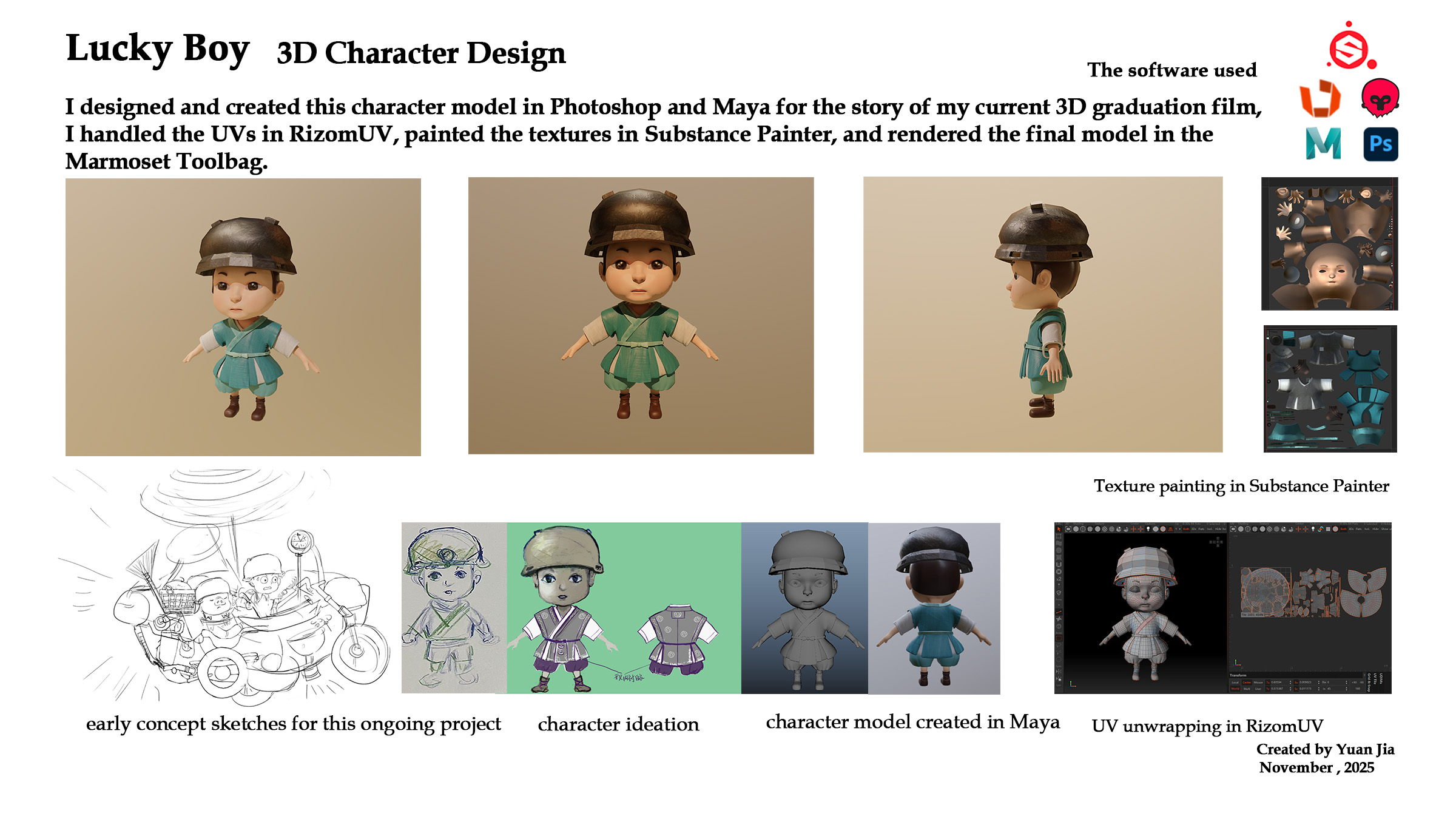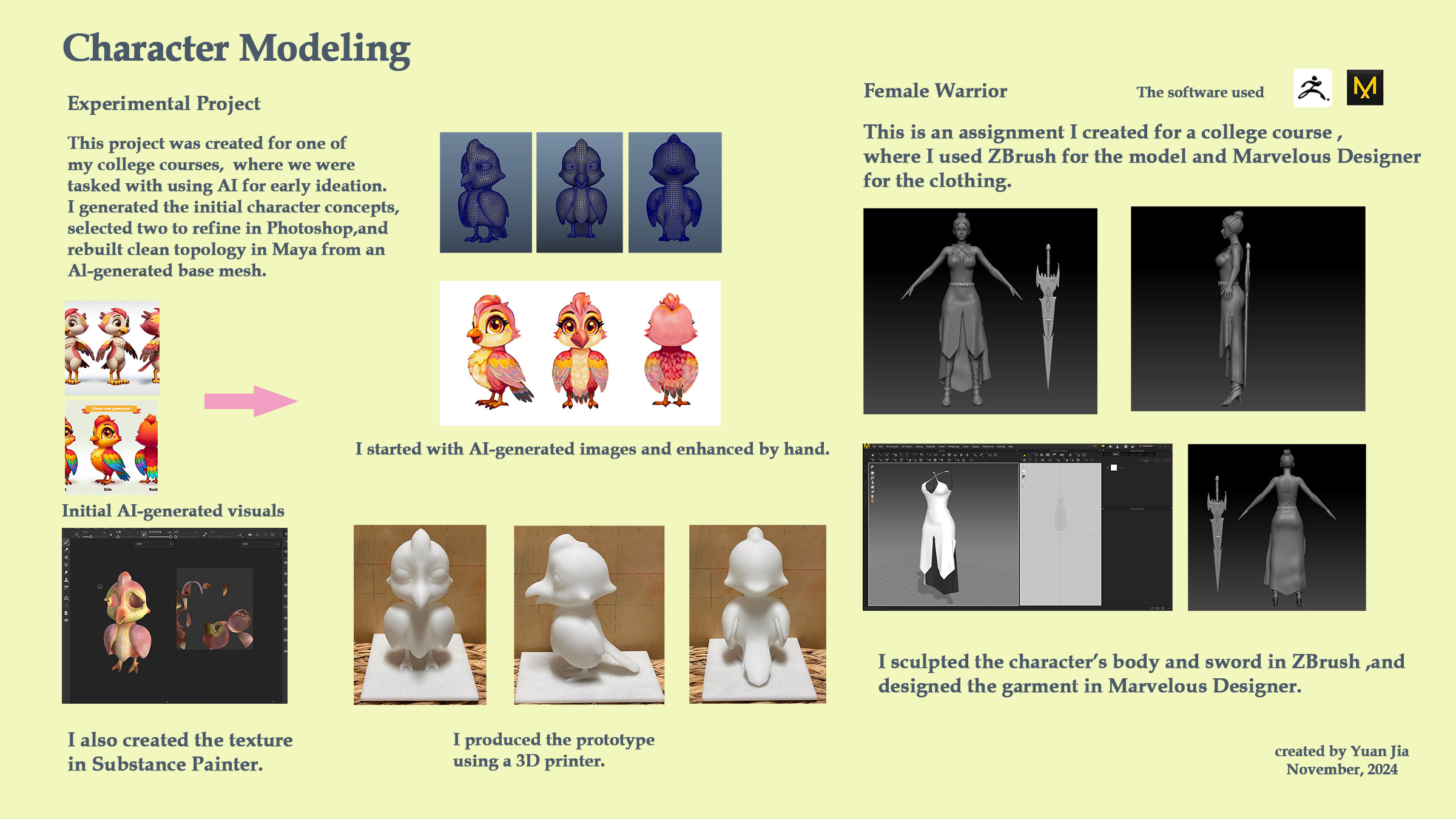 Jun. 2025 – Sept. 2025, Shanghai Wuliu Culture Co., Ltd., Modeled and textured high-quality 3D characters and props using Maya, ZBrush, and Substance Painter.